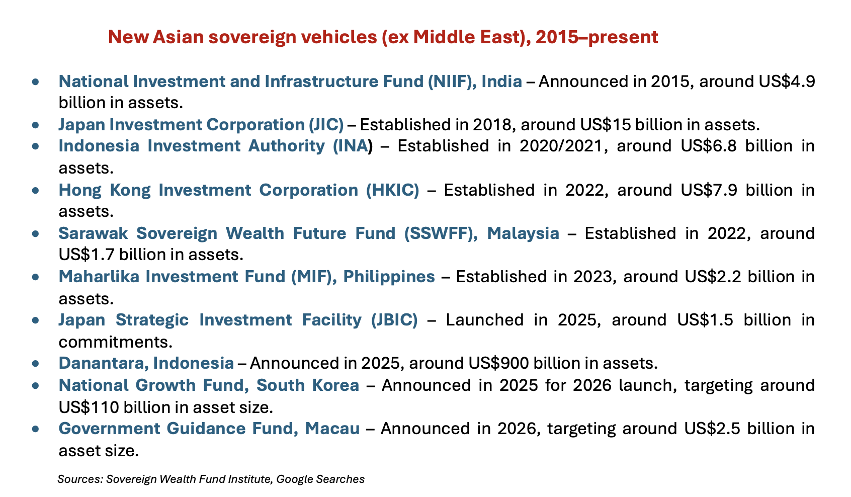 Hong Kong launched its Investment Corporation in 2022 and the Philippines’ Maharlika Investment Fund (MIF) was set up in 2023. Meanwhile, South Korea announced plans for a National Growth Fund which is expected to be launched this year, and Macau introduced a Government Guidance Fund to diversify its economy beyond gaming.