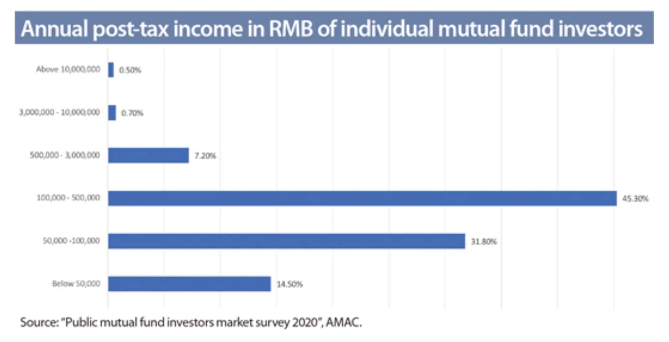 Over 53% of China’s public mutual funds were held by individual investors in 2020, according to an annual survey by the Asset Management Association of China (AMAC). More than 45% of these investors were in the 100,000-500,000 RMB annual post-tax income bracket, a sharp increase from 25.8% in 2016. And over 8% had annual post-tax income exceeding 500,000 RMB compared with just 3% in 2016.